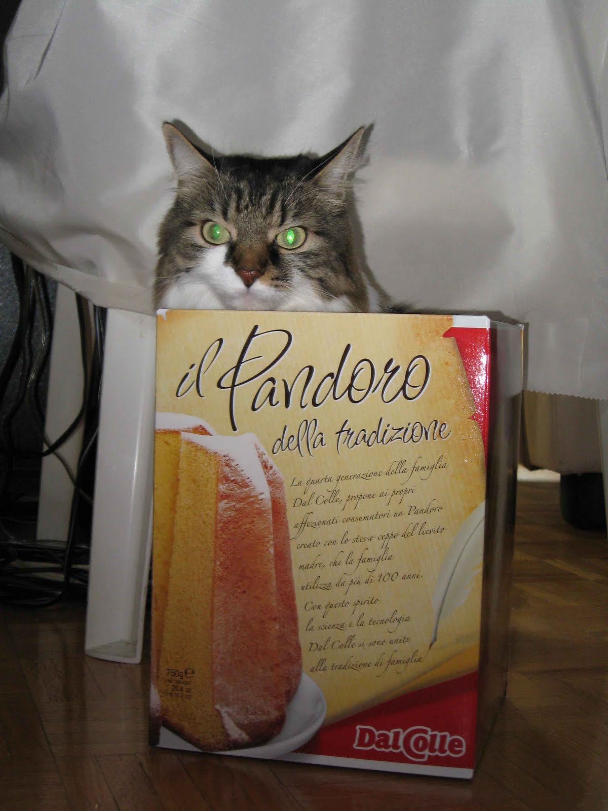 Since then they have become like naked babies (neotony is the name for that). They have lost their conscious abilities to think as sensibly as we do. So don't worry about it, Fluffy. You look wonderful in that box. The humans will notice you maybe even if they don't know they are. The only problem might be that they forget to read the name on the box because you are so much much more attractive than panetone.